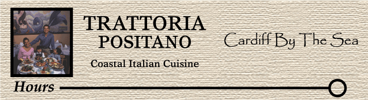 Mon-Fri 11:30AM-2:00PM 5:00PM-10:00PM Sat 12:30PM-10:00PM Sun 3:00PM-10:00PM Trattoria Positano Cardiff by the Sea Location 2171 San Elijo Avenue Cardiff By The Sea, CA(760)-632-0111 (get map) email contact: cardiff@trattoriapositano.com